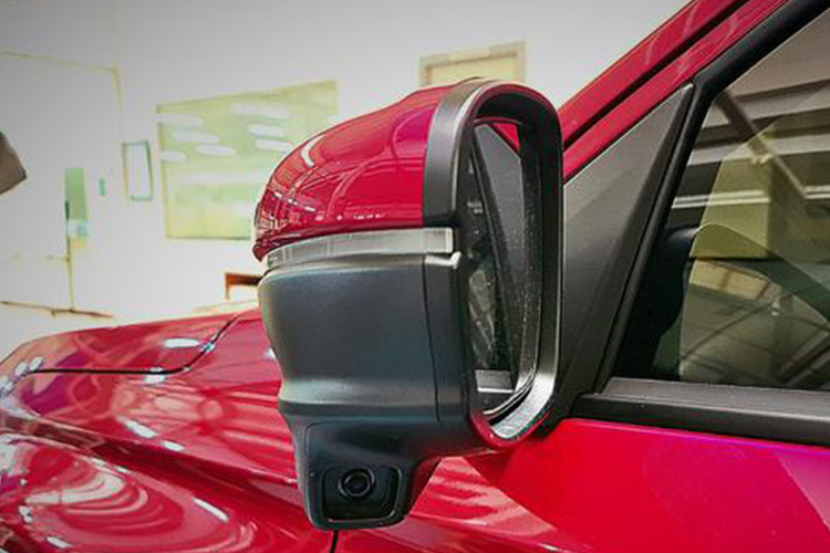 The LaneWatchTM feature is positioned on the left mirror of the Honda WR-V. This feature provides drivers with greater visibility and clarity of the road conditions on the left side of the vehicle. The information is displayed on the head unit screen, allowing drivers to stay alert and navigate safely. Drivers can activate the LaneWatch feature by pressing the left turn signal lever or by pressing the dedicated button on the turn signal lever.